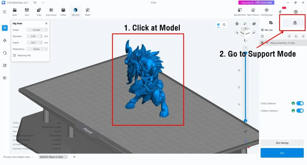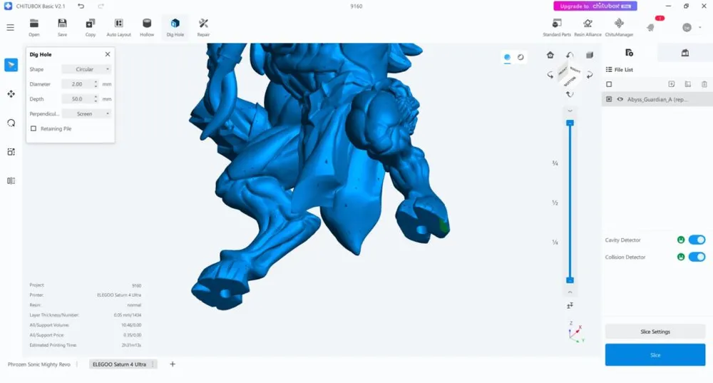 - การกลวงชิ้นงาน (Hollow) และการเจาะรูระบายเรซิน (Drain Hole) ซึ่งทำเพื่อลดปริมาณเรซินที่ใช้ เพิ่มอัตราการพิมพ์สำเร็จ โดยเฉพาะ Saturn 4 Ultra ที่มีกลไกการพิมพ์แตกต่างจากเครื่องทั่วไป และ สุดท้ายเพื่อลด/กำจัด Suction Cup ในชิ้นงาน