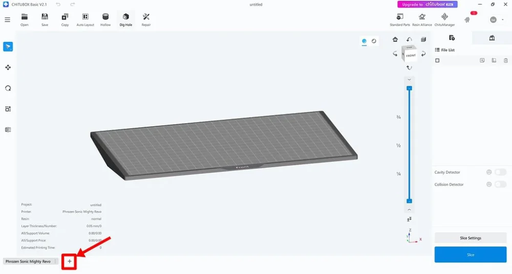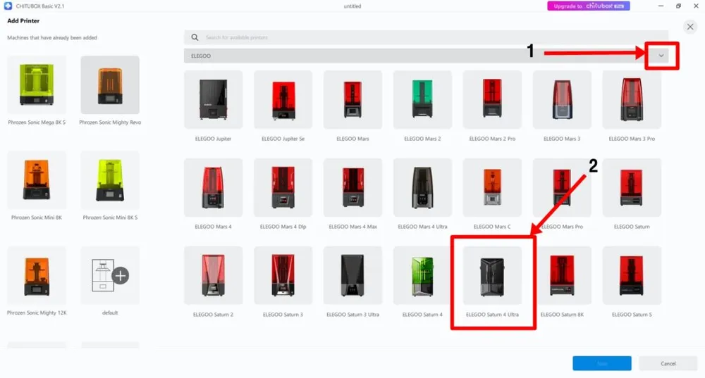 - Chitubox ที่สนับสนุนจะเป็นเวอร์ชั่น 2.0 เป็นต้นไป หลังจากลงโปรแกรมเสร็จเลือกเครื่อง Elegoo Saturn 4 Ultra