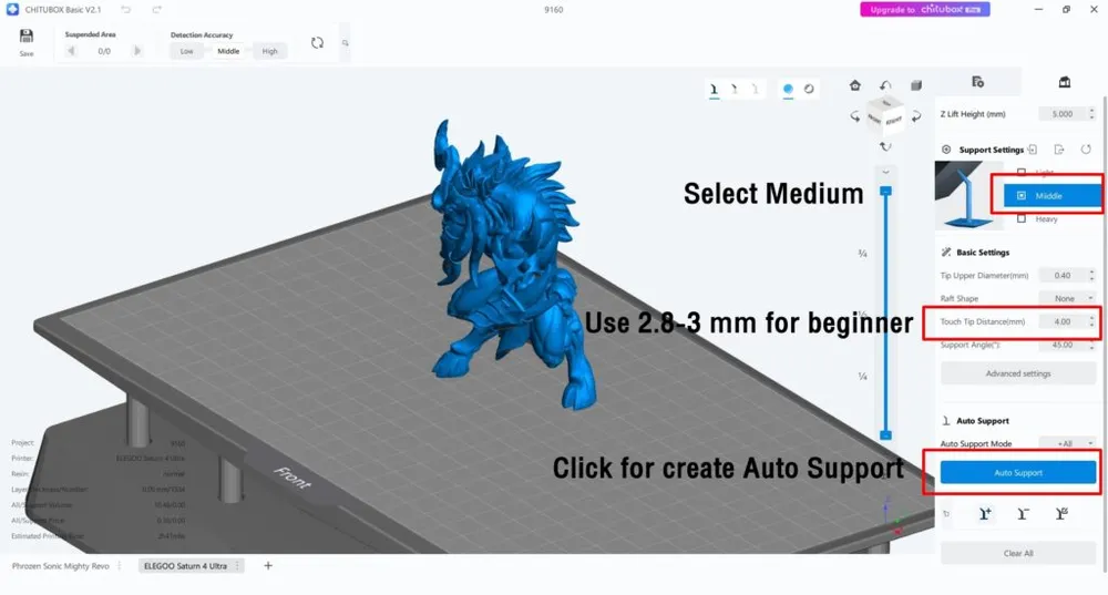 - ในเบื้องต้นสำหรับมือใหม่ แนะนำให้เลือก Support ขนาด Medium และค่าระยะห่างระหว่าง Support หรือ Touch Tip Diameter ที่ 2.8 mm จากนั้นกด Auto Support
