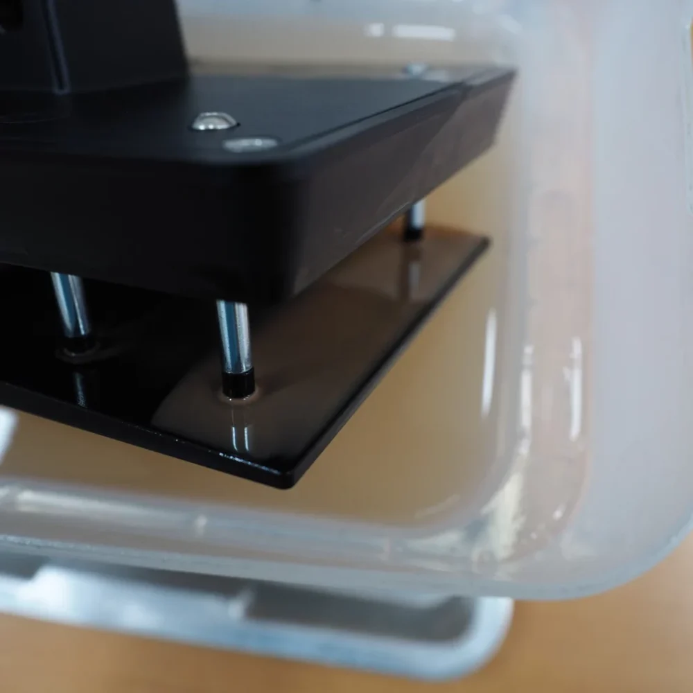 - ในส่วนของ Saturn 4 Ultra จะมีเรซินติดตามฐานพิมพ์ด้านใต้ที่ยึดเสมอ ส่วนที่ต้องล้างและเช็ดให้สะอาด เพื่อป้องกันการปนเปื้อน หรือ IPA ค้างอยู่ที่ฐานพิมพ์